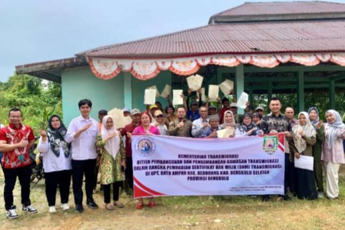 Sertifikat tanah milik warga transmigrasi UPT di Batu Ampar, Kecamatan Kedurang, diserahkan langsung oleh Kepala Kantor Badan Pertanahan Nasional (BPN) Kabupaten Bengkulu Selatan, Azman Hadi, disaksikan oleh tokoh masyarakat, Babinsa, dan tamu undangan lainnya.